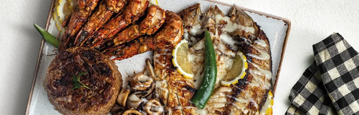 Wolfsbarschfilet, 2 Garnelen, 2 Kalamares, Lachs mit Gemüse