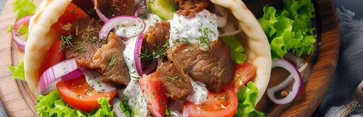 Gyros, 1 Suflaki, Hacksteak, Tzatziki, Reis, Pommes frites, Salat