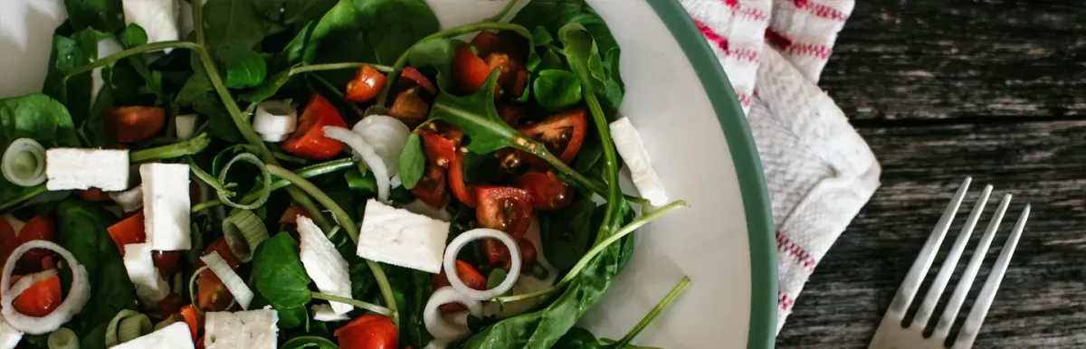 mit Tomaten, Gurken, Oliven, Peperoni, Zwiebeln und Feta, dazu Brot